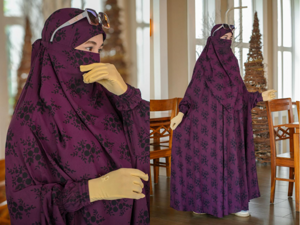 Embrace royal elegance with the Amethyst Bloom Jilbab Set. This exquisite piece features a rich Deep Purple base adorned with a charming black/dark floral print. The deep, saturated color offers a sophisticated, striking look perfect for any special gathering. Crafted from premium, Soft, Lightweight Century Fabric, this jilbab ensures a beautiful drape and superior comfort. The set provides full coverage and includes a seamlessly integrated 30-inch niqab for perfect, discreet face coverage.