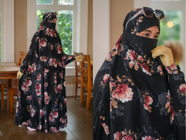 Define dramatic elegance with the Black Peony Dream Jilbab Set. This exquisite piece features a deep classic Black base adorned with large, detailed pink and rose-toned Peony floral prints. This striking contrast offers a sophisticated and artistic look, perfect for special occasions. Crafted from premium, Soft, Lightweight Century Fabric, this jilbab ensures a beautiful drape and superior comfort. The set provides full coverage and includes a seamlessly integrated 30-inch niqab for perfect, discreet face coverage.