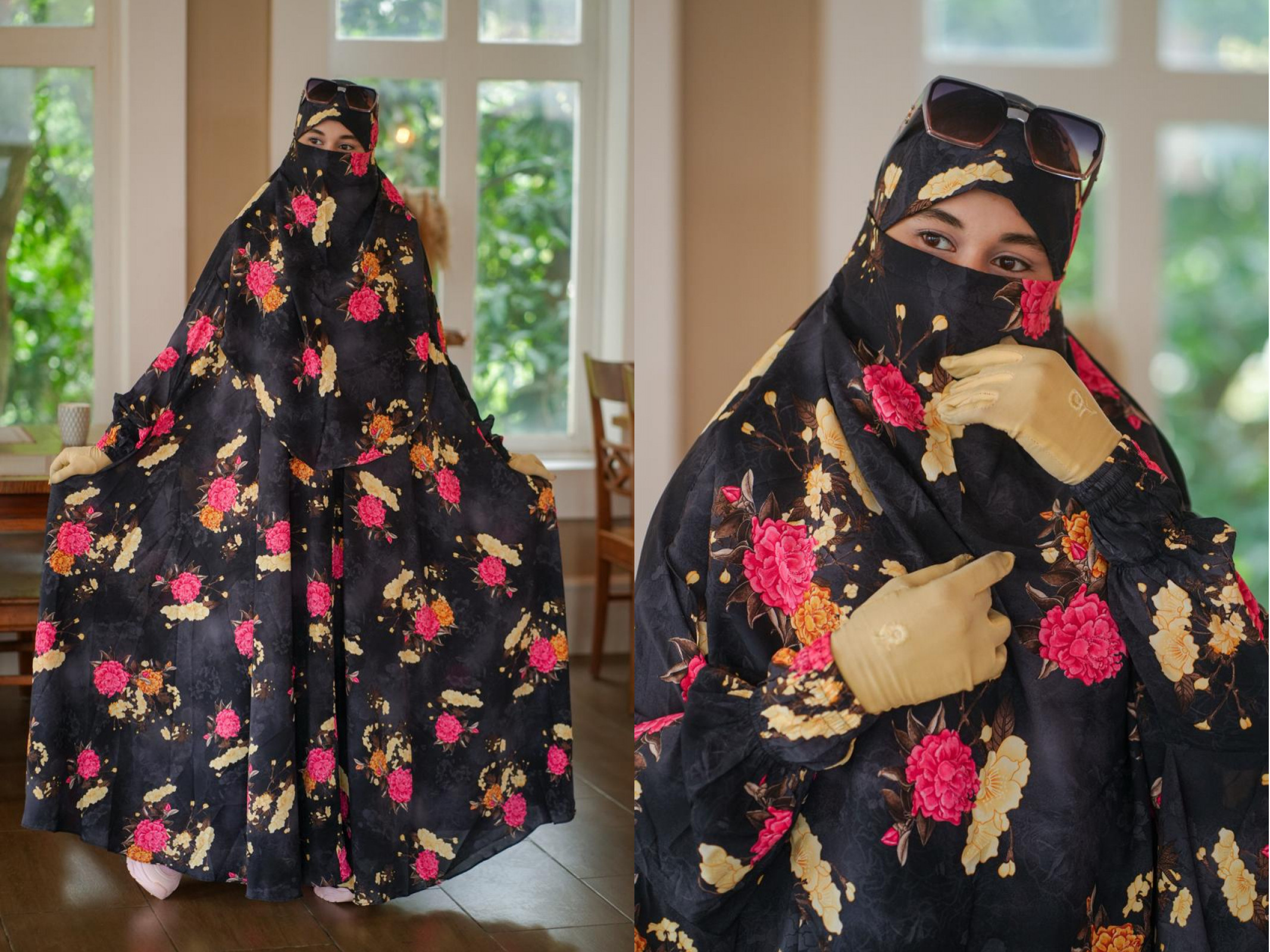 Define dramatic elegance with the Black Sunset Bloom Jilbab Set. This exquisite piece features a rich classic Black base adorned with bold pink and sunset yellow/orange floral prints. This striking contrast offers a sophisticated and artistic look, perfect for special occasions. Crafted from premium, Soft, Lightweight Century Fabric, this jilbab ensures a beautiful drape and superior comfort. The set provides full coverage and includes a seamlessly integrated 30-inch niqab for perfect, discreet face coverage.