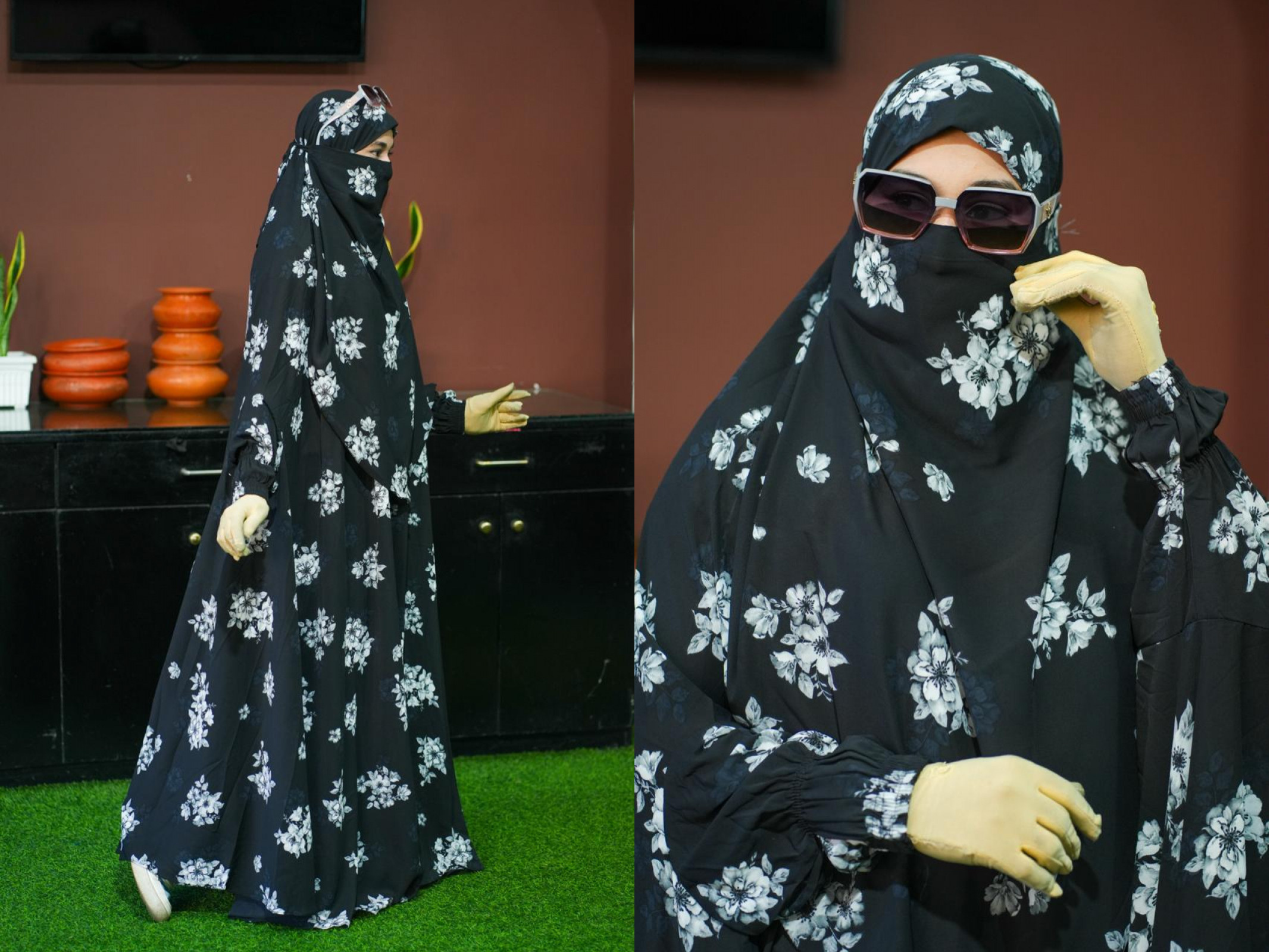 Define timeless elegance with the Classic Noir Floral Jilbab Set. This exquisite piece features a rich solid Black base adorned with striking White floral prints. The high-contrast design offers a sophisticated, classic look perfect for any formal or casual setting. Crafted from premium, Soft, Lightweight Century Fabric, this jilbab ensures a beautiful drape and superior comfort. The set provides full coverage and includes a seamlessly integrated 30-inch niqab for perfect, discreet face coverage.