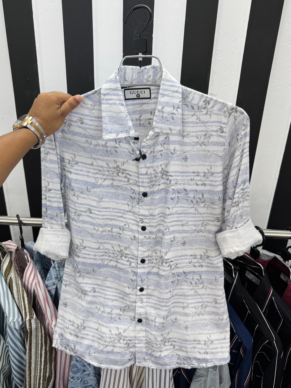 Define light, artistic style with the Gucci Blue Floral Wave Shirt. This unique piece features a crisp white base adorned with horizontal light blue stripes (giving a wave effect) and a delicate grey floral/vine print. The subtle colour palette and artistic pattern are perfect for daytime events, summer outings, or a relaxed smart-casual style. Crafted for comfort, this long-sleeve shirt offers a modern fit and signature brand detailing.