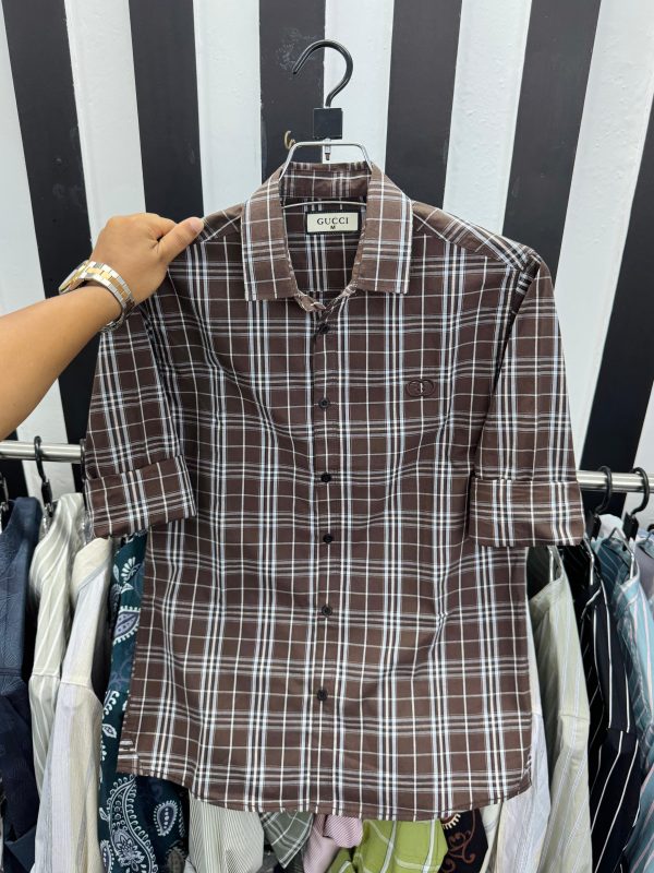 Elevate your smart-casual look with the Gucci Chocolate Gingham Shirt. This sophisticated piece features a rich dark brown base complemented by crisp white and light blue checks, creating a timeless Gingham/Plaid pattern. The deep, earthy color palette makes it versatile for all seasons and perfect for office wear, evening outings, or weekend style. Crafted for comfort, this long-sleeve shirt offers a sharp, modern fit and signature brand detailing.