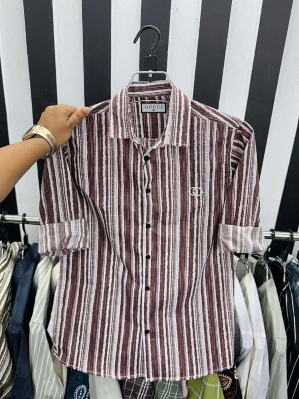 Define effortless sophistication with the Gucci Mocha Vertical Stripe Shirt. This striking piece features bold vertical stripes in a rich mocha brown and burgundy blend, contrasted with clean white lines. This multi-toned pattern creates a strong, polished look that is both modern and versatile. Crafted for comfort, this shirt offers a sharp fit and signature brand detailing, making it the perfect choice for an elevated casual look or weekend outings.