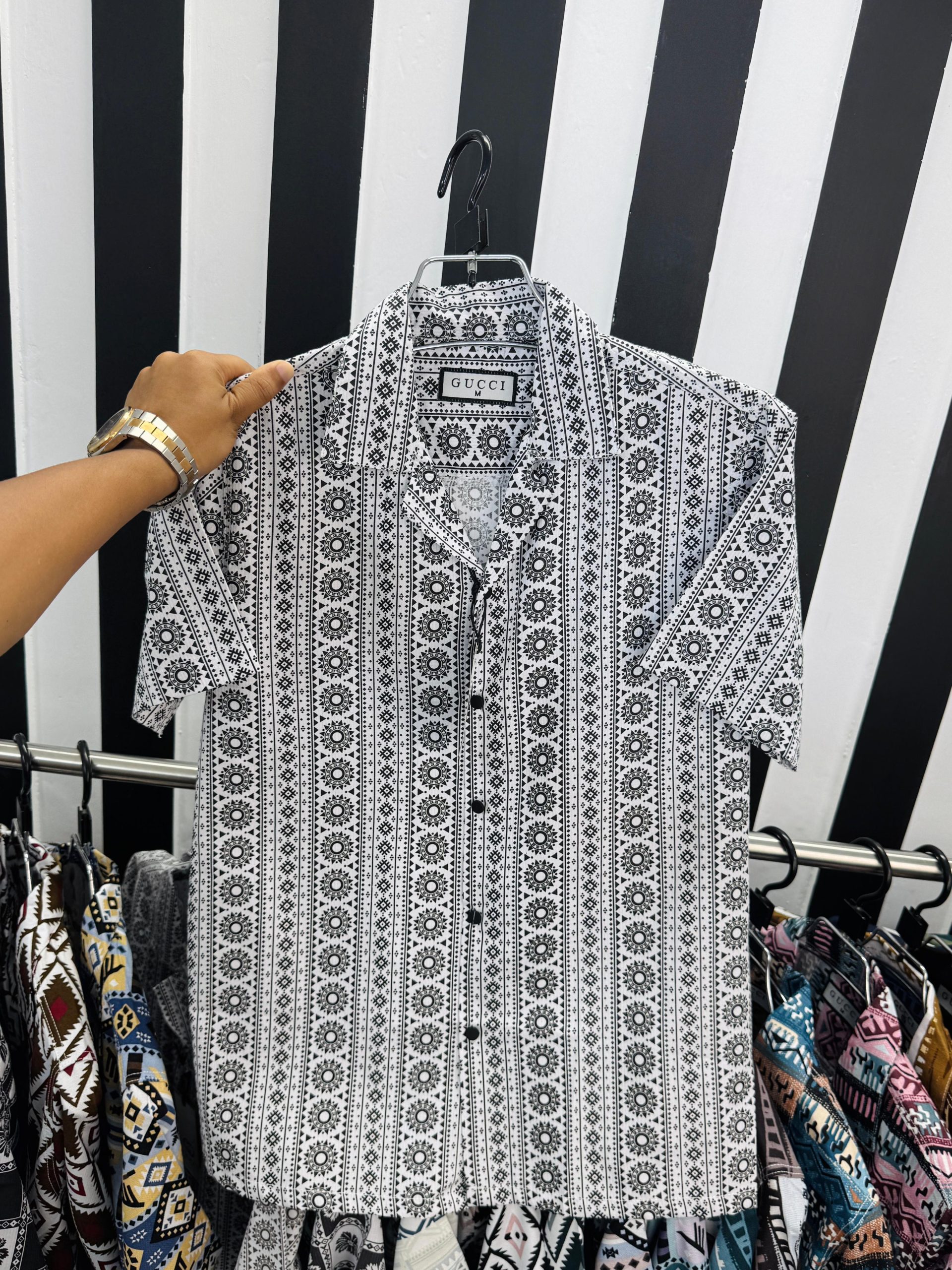 Define sleek, patterned style with the Gucci Monochrome Ethnic Stripe Shirt. This eye-catching half-sleeve piece features bold vertical stripes interspersed with intricate black floral and geometric motifs on a crisp white base. The unique, high-contrast print and the relaxed Cuban (Camp) Collar make it an essential for summer parties, urban outings, and standout resort wear. This shirt blends ethnic inspiration with modern comfort.