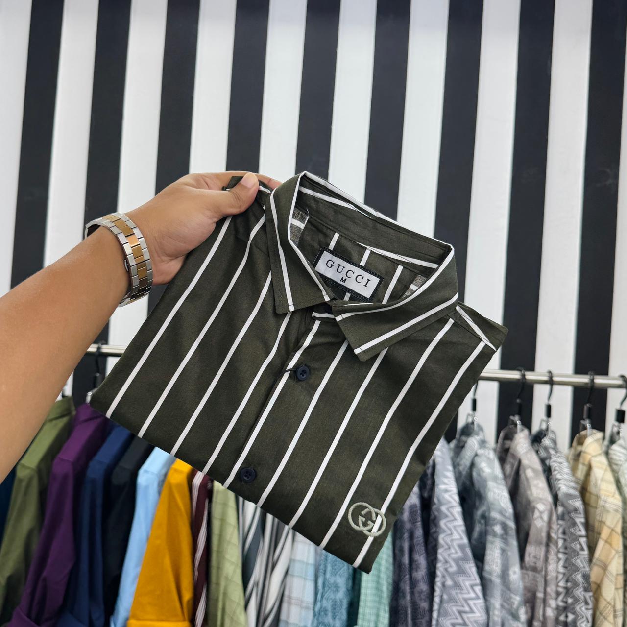 Define strong, contemporary style with the Gucci Olive Bold Stripe Shirt. This striking piece features clean, thick white vertical stripes on a deep olive green base, creating a high-contrast, sharp, and confident look. Perfect for evening events, urban outings, or an elevated casual style. Crafted for comfort, this long-sleeve shirt offers a modern fit and signature brand detailing.