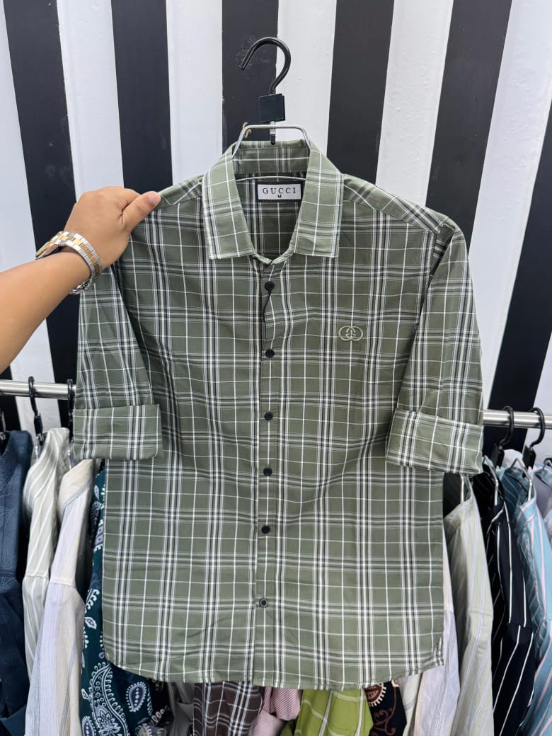 The Gucci Olive Tartan Elegance shirt is a sophisticated wardrobe essential for the modern man. This premium shirt features a subtle, classic plaid pattern (Tartan Check) in a refined combination of muted olive green, black, and white. Its design ensures a clean, streamlined fit that flatters all body types. Perfect for versatility, you can dress it up for office meetings and semi-formal dinners or wear it casually with denim. The soft texture guarantees all-day comfort while maintaining a sharp, structured look. This piece is a truly timeless investment in classic style.