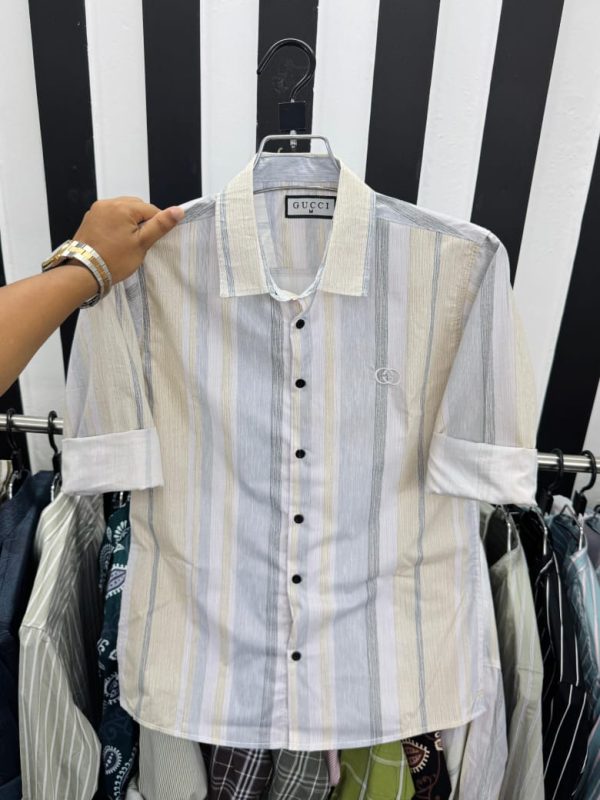 Define effortless summer style with the Gucci Pastel Vertical Stripe Shirt. This elegant piece features a light cream/off-white base with subtle, muted vertical stripes in soft blue, grey, and pale yellow. This multi-tone pattern creates a refined, sophisticated look perfect for any casual or semi-formal daytime occasion. Crafted for comfort, this long-sleeve shirt offers a modern fit and signature brand detailing. It’s the ideal choice for a polished yet relaxed aesthetic.