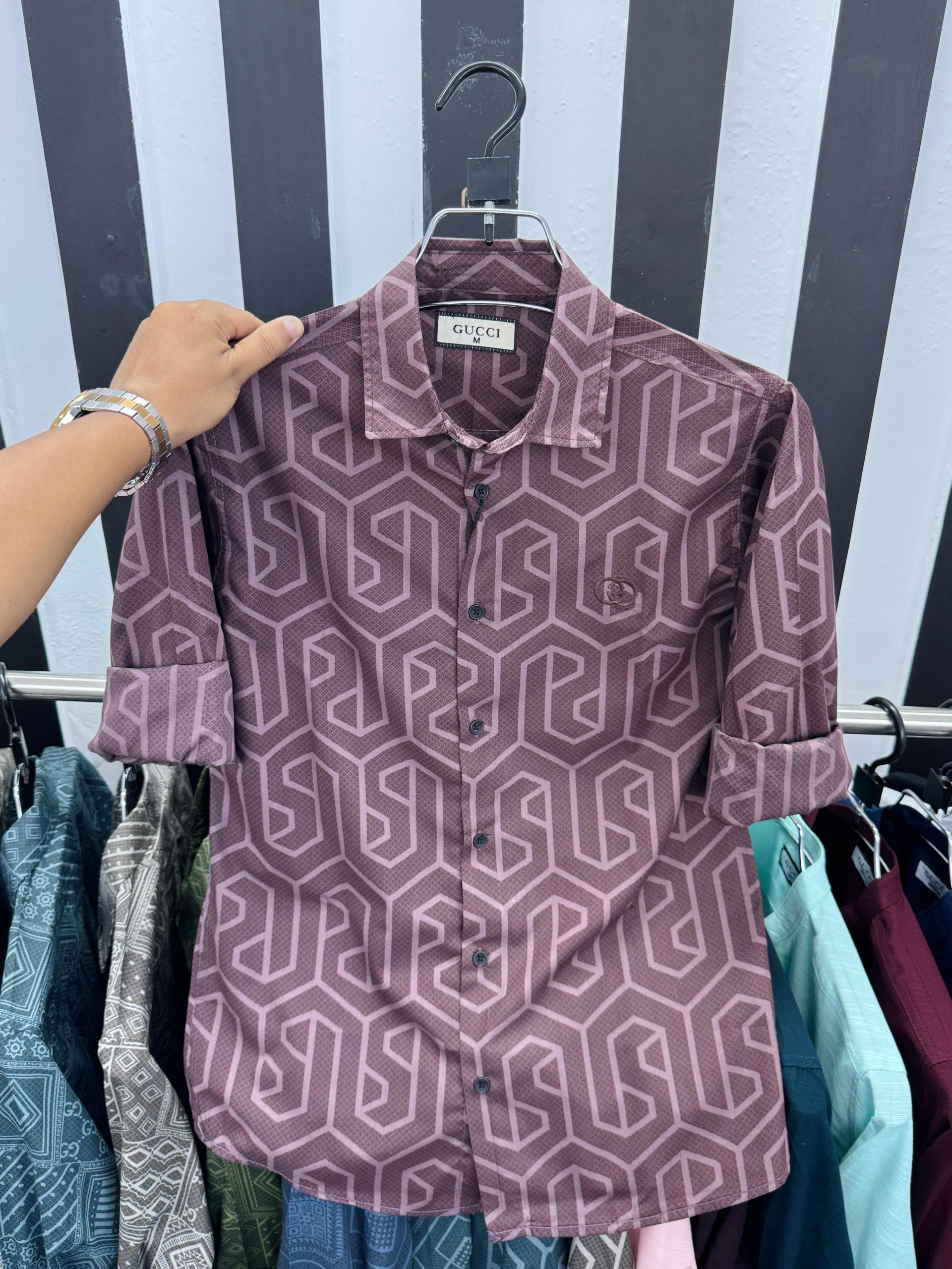 Define sleek, contemporary style with the Gucci Plum Geo-Lattice Shirt. This eye-catching piece features a sophisticated deep plum/burgundy base adorned with a bold, interlocking geometric lattice pattern in a lighter pink tone. The dynamic, architectural print offers a modern, artistic flair perfect for urban outings, parties, and standout casual wear. Crafted for comfort, this long-sleeve shirt offers a versatile fit and signature brand detailing.
