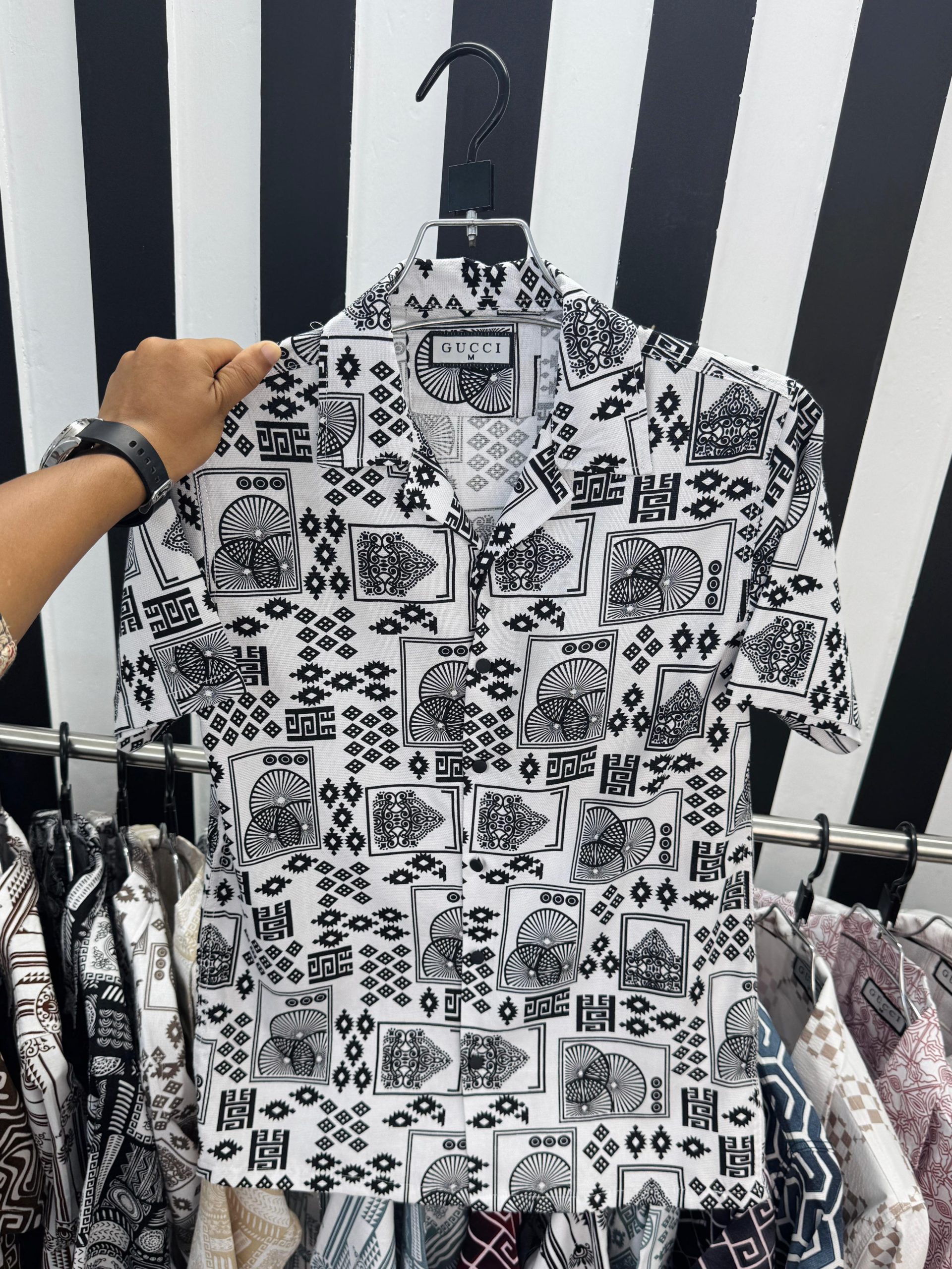 Define modern style with the Gucci Monochrome Geometric Pop Shirt. This sleek half-sleeve shirt features a high-contrast black and white abstract pattern that is both dynamic and visually striking. The bold geometric motifs and comfortable fit make it an ideal choice for urban streetwear and social events. Pair it with trousers for an edgy look or shorts for a cool, contemporary summer ensemble.