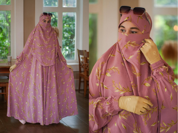 Experience subtle luxury with the Rose Gold Leaf Jilbab Set. This exquisite piece features a gentle dusty rose pink base with an elegant golden vine/leaf print. This unique combination offers a sophisticated and rich look. Crafted from premium, Soft, Lightweight Century Fabric, this jilbab ensures a beautiful drape and superior comfort. The set provides full coverage and includes a seamlessly integrated 30-inch niqab for perfect, discreet face coverage.